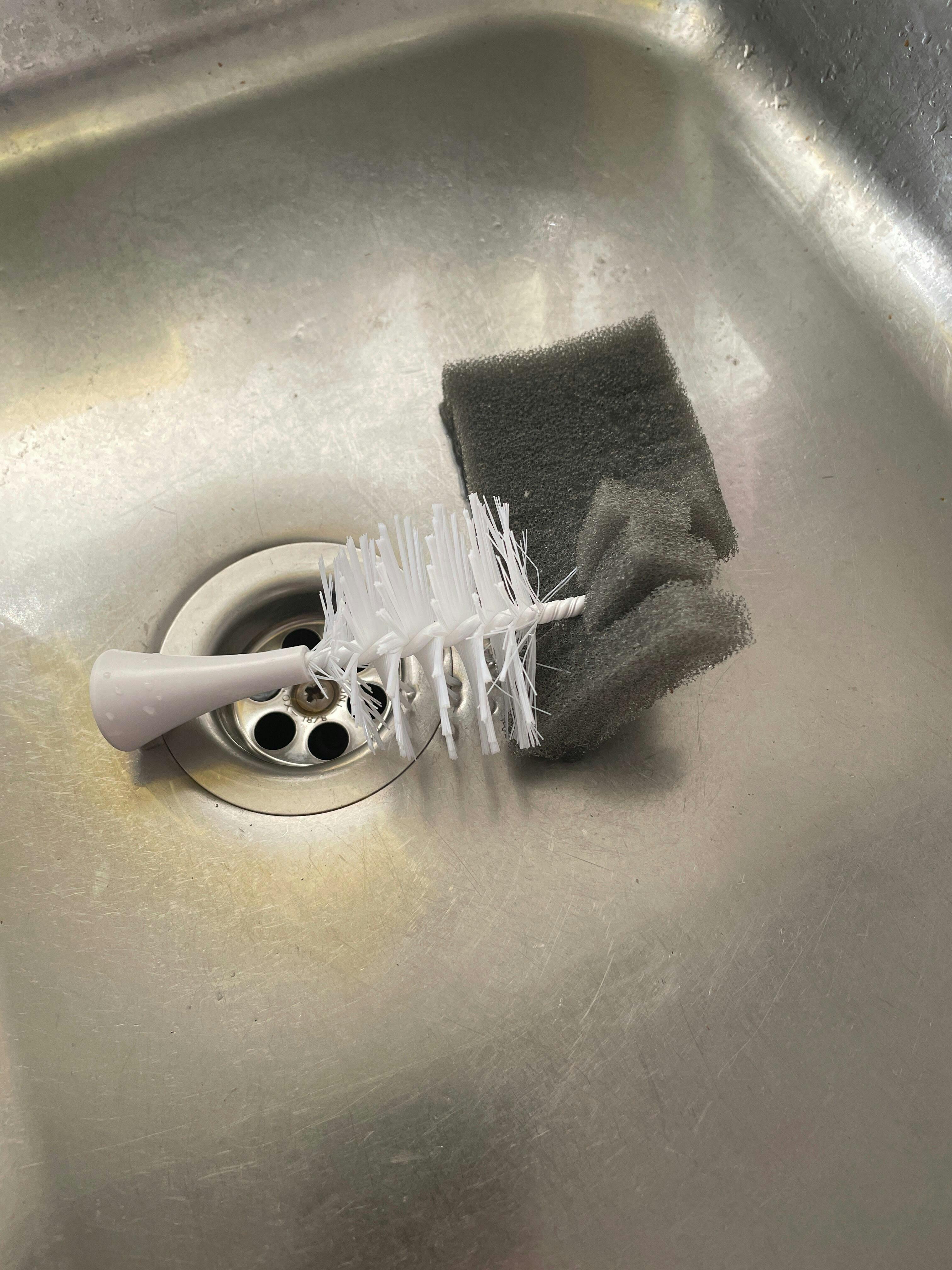Med det extra medföljande borsthuvudet rengör du enkelt mindre delar som dinappar och ventiler. Det greppvänliga handtaget har en mjuk silikonyta som ligger bekvämt i handen, och borsten står stabilt upprätt på diskbänken tack vare en praktisk sugpropp i botten.